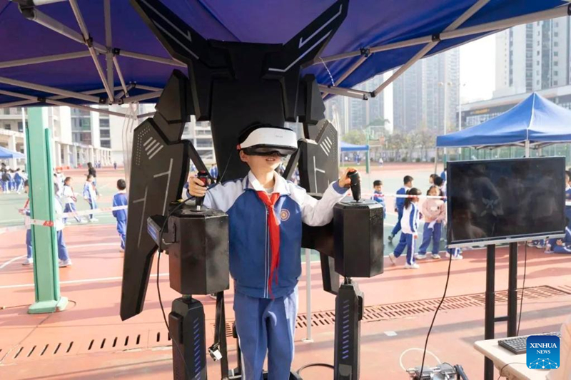 นักเรียนใช้อุปกรณ์แว่น VR เอไอ ที่โรงเรียนในเมืองกวางตุ้ง ทางตอนใต้ของจีน เมื่อวันที่ 21 มีนาคม 2568 (ซินหัว)