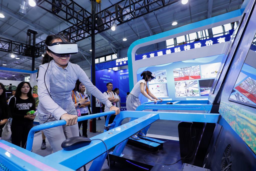 ผู้เยี่ยมชมสัมผัสประสบการณ์เล่นสกีด้วยแว่นตา VR ในงาน CIFTIS 2025 ที่กรุงปักกิ่ง เมืองหลวงของจีน เมื่อวันที่