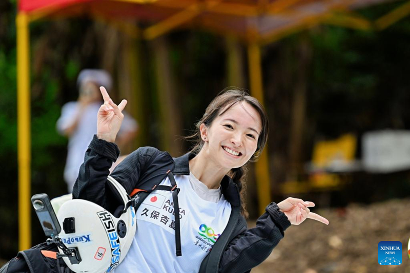 | อานิกา คูโบะ ในระหว่างการแข่งขันกีฬาเอ็กซ์ตรีมบริดจ์ระดับนานาชาติ 2025 ที่มณฑลกุ้ยโจว ทางตะวันตกเฉียงใต้ของจีน เมื่อวันที่ 26 กันยายน 2568 (ซินหัว) |