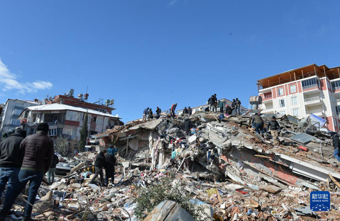 วันที่ 8 กุมภาพันธ์ เจ้าหน้าที่กำลังค้นหาผู้รอดชีวิตใต้ซากอาคารที่พังถล่มจากเหตุแผ่นดินไหวในจังหวัดอะดียามันทางตะวันออกเฉียงใต้ของตุรกี