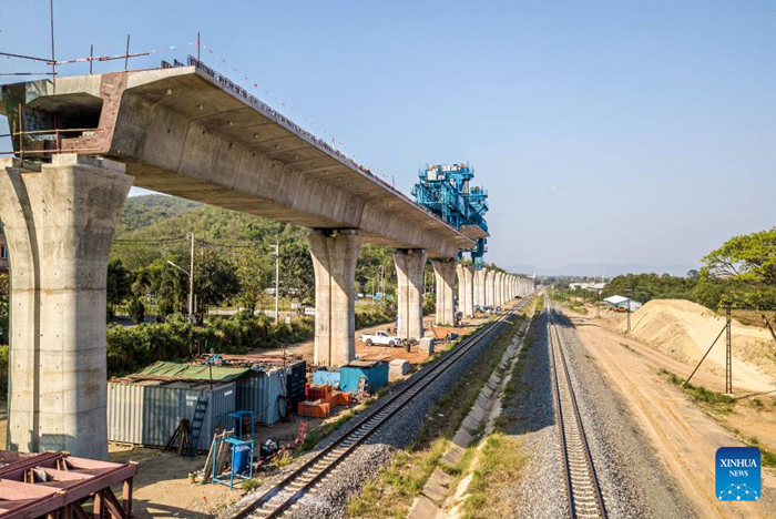 ภาพถ่ายทางอากาศเมื่อวันที่ 23 กุมภาพันธ์ 2566 แสดงให้เห็นสถานที่ก่อสร้างทางรถไฟจีน-ไทยในจังหวัด