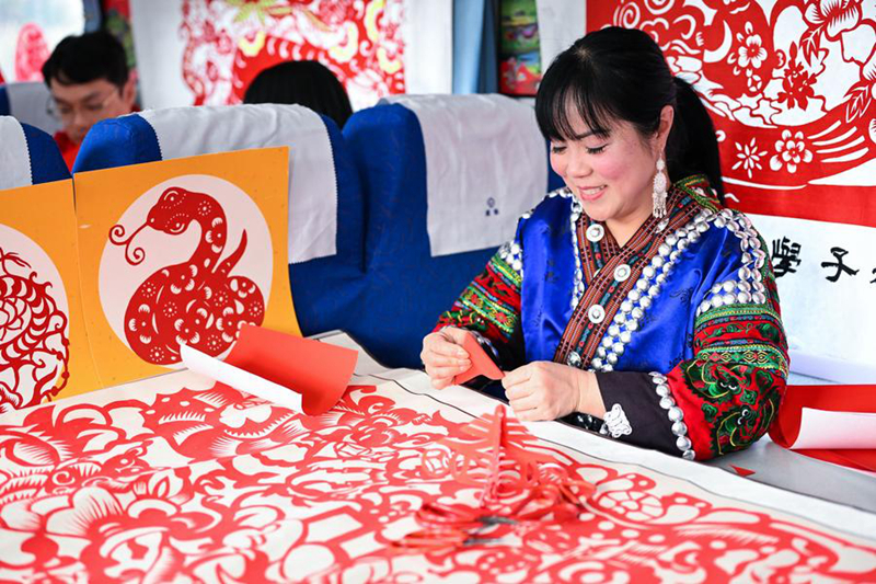 | ผู้สืบทอดมรดกทางวัฒนธรรมที่จับต้องไม่ได้กำลังสาธิตการตัดกระดาษแบบจีนบนขบวนรถไฟสายที่ 5640 ในมณฑลกุ้ยโจว ทางตะวันตกเฉียงใต้ของจีน เมื่อวันที่ 18 มกราคม 2568 (ซินหัว) |