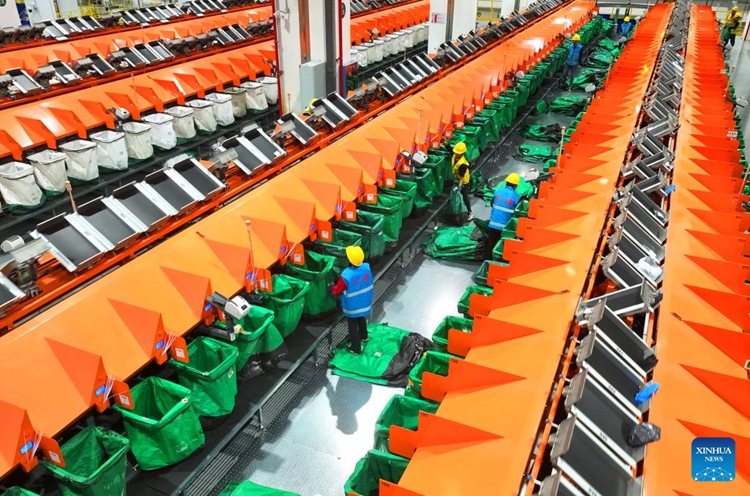 พนักงานกำลังคัดแยกพัสดุที่สาขาไปรษณีย์จีนในเมืองเหิงหยาง มณฑลหูหนาน ทางตอนกลางของจีน บริษัทอีคอมเมิร์ซ