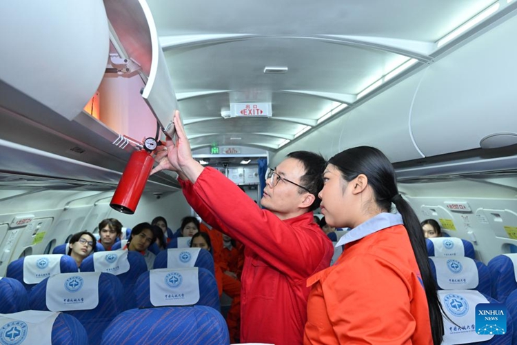 | ชื่อ จวง (ด้านซ้าย) อาจารย์ชาวจีนกำลังสอนนักศึกษาฝึกหัดพนักงานต้อนรับบนเครื่องบินจากประเทศไทย เกี่ยวกับความปลอดภัยในห้องโดยสารจำลอง ณ มหาวิทยาลัยการบินพลเรือนแห่งประเทศจีน (CAUC) ในเมืองเทียนจิน ทางตอนเหนือของประเทศจีน เมื่อวันที่ 20 มกราคม 2569 (ซินหัว) |