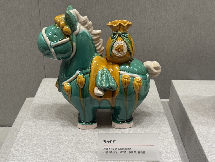 เครื่องปั้นดินเผาเคลือบถังซานไฉ่/เครื่องเคลือบสามสีราชวงศ์ถัง (唐三彩) ชื่อ “ฝูหม่าพั่ง ๆ” ซึ่งจัดแสดงในนิทรรศการ