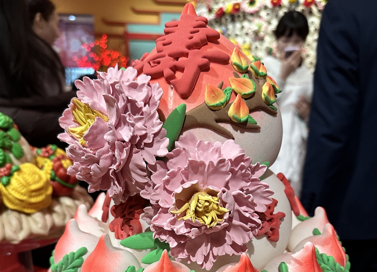 ในพื้นที่จัดแสดงนี้ ฮวาหมัว (花馍) ขนาดใหญ่สูง 4.5 เมตร เส้นผ่านศูนย์กลาง 3.6 เมตร ที่มีชื่อว่า “ต้ากู่จ่าวชาน” (大鼓枣山) ซึ่งเป็นมรดกทางวัฒนธรรมที่จับต้องไม่ได้นั้น น่าทึ่งมาก ผลงานชิ้นนี้สร้างขึ้นด้วยมือทั้งหมดโดยช่างฝีมือพื้นบ้าน 18 คนจากมณฑลส่านซี ใช้เวลากว่าหนึ่งเดือน โดยมีต้นแบบมาจากกลองขนาดใหญ่ และสื่อถึงจิตวิญญาณของภูเขาพุทรา ผสมผสานองค์ประกอบของมังกร ฟีนิกซ์ และดอกไม้ อย่างลงตัวและเป็นสามมิติ สื่อถึงความปรารถนาของชาวจีนในเรื่องความอุดมสมบูรณ์ การรวมญาติ และความเจริญรุ่งเรือง