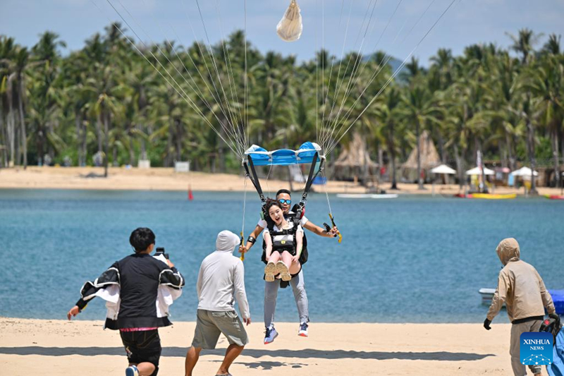 นักท่องเที่ยวกระโดดร่มที่เมืองซานย่า มณฑลไห่หนาน ทางตอนใต้ของจีน เมื่อวันที่ 2 พฤษภาคม 2568 (ซินหัว)