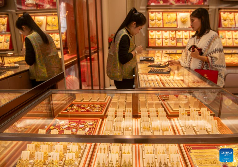 ลูกค้าเลือกซื้อเครื่องประดับทองคำที่ร้านทองแห่งหนึ่งในมณฑลไห่หนาน ทางตอนใต้ของจีน เมื่อวันที่ 29 มกราคม 2569