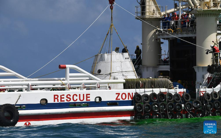 | แคปซูลกลับสู่โลกของยานอวกาศเมิ่งโจวรุ่นใหม่ถูกยกขึ้นสู่เรือกู้ภัย เมื่อวันพุธที่ 11 กุมภาพันธ์ 2569 (ซินหัว) |